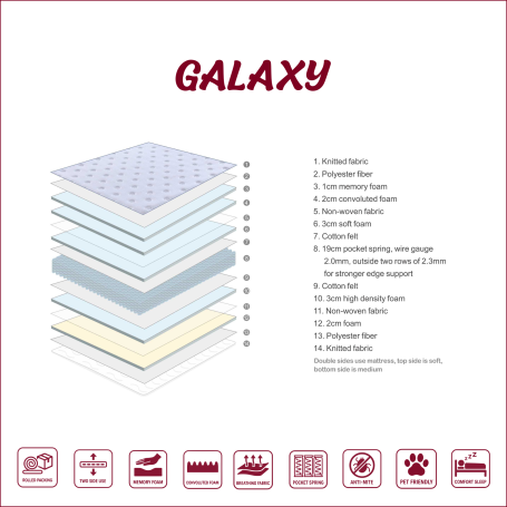 Die Galaxy-Matratze kombiniert zwei Härtegrade (wendbar) mit, druckentlastendem Memory-Schaum und atmungsaktiven Materialien für traumhaften Schlafkomfort. Ob man lieber weich oder fest liegst – Galaxy passt sich flexibel Ihren Bedürfnissen an und bietet entspannte Nächte.