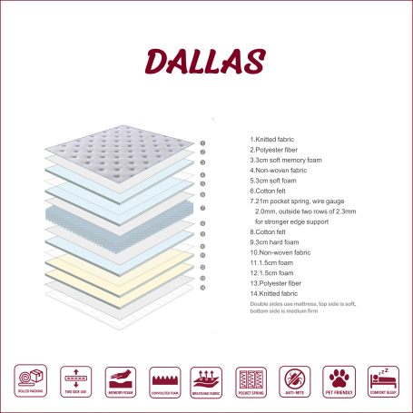 Die Dallas-Matratze vereint beidseitige Härtegrade! Druckentlastender Memory-Schaum, Ihre 22 cm hohen Tonnentaschenfedern und atmungsaktive Materialien ermöglichen den perfekten Schlaf. Ob du es lieber weich oder fest magst Dallas passt sich deinen Bedürfnissen an. Für erholsame Nächte und kraftvolle Tage.